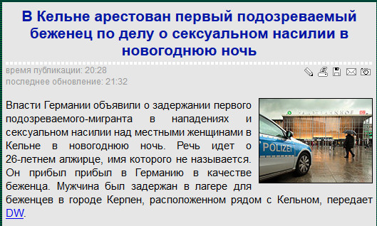 Послушал последний выпуск "Сути событий" с Пархоменко. Что-то как-то ни о чем. Две трети передачи Пархоменко сообщал, в основном, вполне известные факты о событиях под новый год в Кельне и некоторых других городах Германии, причем об этих событиях за прошедшие с того момента две недели (Пархоменко был в отпуске) не говорил и не писал только ленивый.