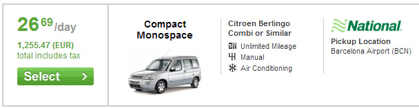 Вот смотрите. Берем для примера компактную, но вместительную таратайку, типа Citroen Berlingo, Peugeot Partner, Volkswagen Caddy. Период - с 30 октября по 6 декабря, аэропорт Барселоны.