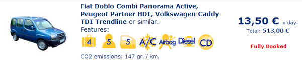 Идем на Economycarrentals. Я раньше им пользовался, теперь перестал - сервис дико испортился (при этом очень активно рекламируется), уже нет никакого смысла: цены стали вовсе не economy (напрямую в прокате очень часто можно найти заметно дешевле), а кроме того, могут сделать бронь, снять неплохую сумму (с меня в последний раз сняли что-то вроде 260 евро), а потом мурыжить дней пять, не давая подтверждения. Больше я с ними не связываюсь. Ну и вот яркий пример, что мне выдали по самому экономичному варианту.