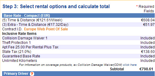 Теперь заглянем на сайта Alamo - так, чисто поржать. У них на сайте цены показываются очень хитро - в каких-то попугаях, несмотря на то, что вроде указано в евро. Просто это стоимость проката, при котором машина не выезжает за пределы конторы - ну, не знаю, может, в ней при этом можно жить.