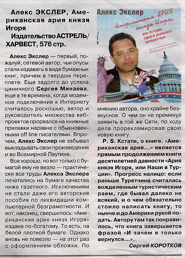Удостоился рецензии на "Американскую арию князя Игоря" в газете "Новая среда". Бумагу похвалили. Белая, сказали, бумага, хорошая. (Кстати, и правда, обычно "АСТ" книжки на такой галимой газете печатает - что это они в этот раз?) Ну и отметили, что автору в Америке понравилось. Зачем, сказал автор, я сюда только вернулся. Тонкое наблюдение. Тонкое.