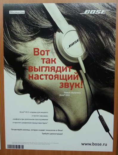 В Киеве видел эту же рекламу, емнип, на бигборде. Мне картинка нравится. Мысли "Bose издевается над покупателями" не возникает. Техникой Bose не пользовался (да и вообще практически ничем, кроме "затычек в уши" для айфона), поэтому непредвзят.