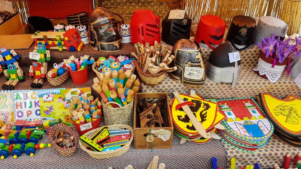 У этой палатки ребенок ожидаемо завис. Ну как же - рыцарские шлемы и прочее снаряжение.