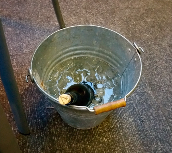 Но дальше было шикарно. Официант сказал, что сейчас принесет ведерко со льдом - и принес эмалированное ведро из моей родной деревни, с которым (ведром, а не официантом) я неоднократно ходил к колодцу по воду. Чес-слово, не вру - вот оно!