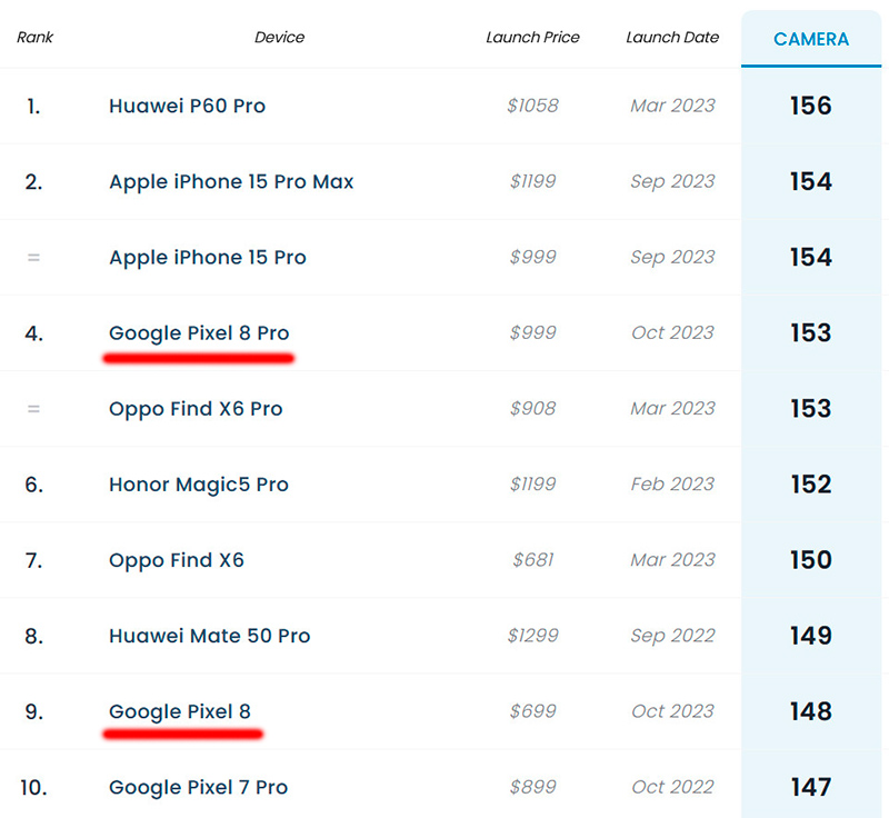 В лаборатории DXOMark протестировали смартфон Google Pixel 8 (версию Pro они протестировали раньше), и в результате поставили Pixel 8 в первую десятку рейтинговой таблицы. Pixel 8 Pro там уже занимал 4-ю позицию.