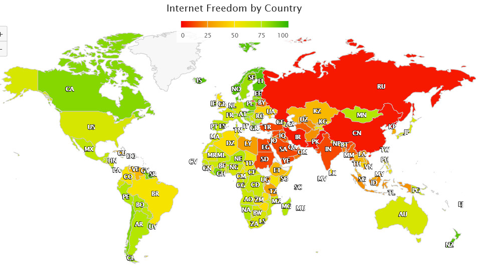 - Северная Корея, где только наиболее доверенные режиму граждане могут пользоваться глобальным интернетом, получила 0 баллов по свободе интернета. Россия, Пакистан, Иран и Китай получили по 4 балла. Страны, занимающие последние места в рейтинге (с оценкой 20 или ниже), расположены на трех континентах: в Азии, Африке и Европе.