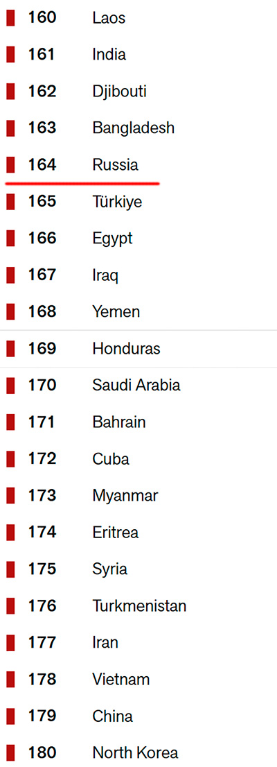 Ну и вот Bottom 20 - 20 стран из конца списка, в которых самая несвободная пресса в мире. Россия туда, разумеется, входит, кто б сомневался, вместе с такими странами как Ирак, Эритрея, Саудовская Аравия, Сирия, Куба и Китай.