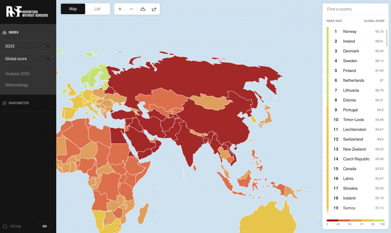 Организация "Репортеры без границ" опубликовала рейтинг свободы прессы за 2023 год.