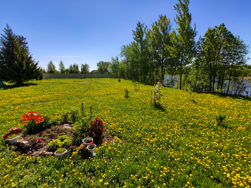 Предположим, что высота забора напротив равна 1,8 м, тогда длина его видимой части составит, примерно 30 м. Предположим также, что правая граница участка проходит по линии деревьев вдоль реки, а левая граница, ограничена линией проходящей вдоль большой ели. Даже если, еще предположить, что автор снимка стоит прямо на границе четвертой стороны участка, то, чисто визуально конечно, площадь участка составит, не менее 12 соток.