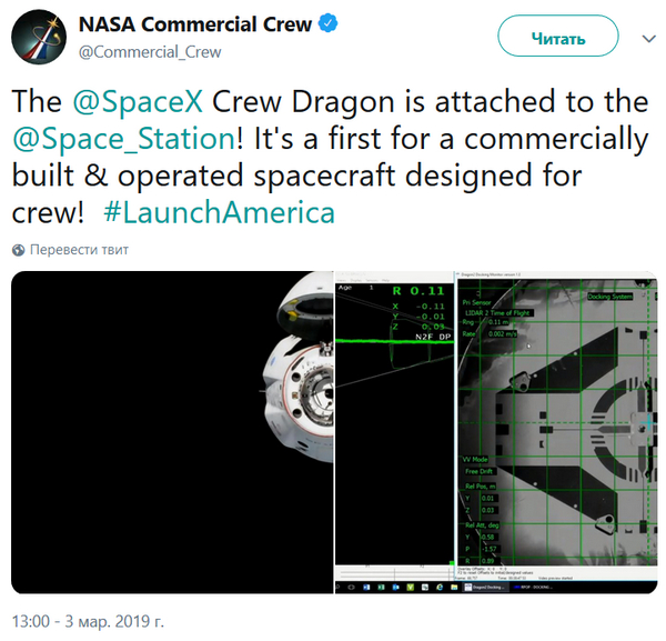 Космический корабль Crew Dragon, разработанный компанией Илона Маска SpaceX для доставки астронавтов на Международную космическую станцию, успешно пристыковался к МКС в автоматическом режиме. Первый в истории пробный запуск Crew Dragon состоялся 2 марта с космодрома космического центра имени Кеннеди во Флориде. На борту корабля находится манекен по прозвищу Рипли. После стыковки с МКС Crew Dragon должен вернуться на Землю. (Отсюда.)