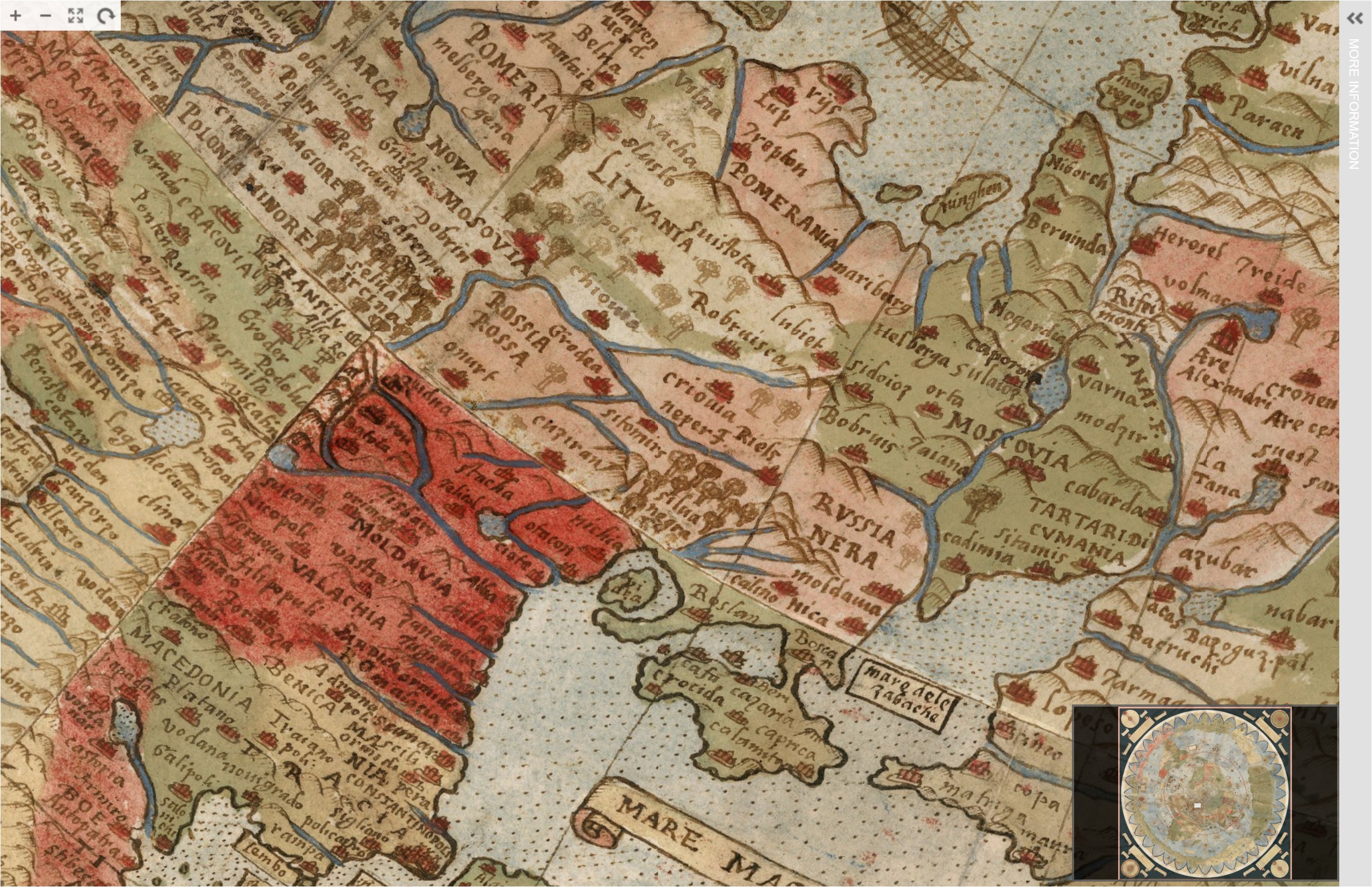 есть еще более старая карта, а фактически первый серьезный атлас мира, сделанный в 1587 году итальянским картографом из Милана Урбано Монте (1544-1613гг) на основании старых карт и собранных им данных мореплавателей и путешественников (в основном испанских и английских) всего лишь спустя 80 лет после открытия Америки. Карта хранится в Стендфордском Университете и несколько лет назад была оцифрована, она предствляет собой собираемую из 60 листов единую картину мира с центром в Антарктике общим размером примерно 3х3 м. И там много всего интересного - например, Россия там таки есть, даже две, помеченных одинаковым цветом (Rossia Rossa - между Moldavia и Litvania, примерно в районе Карпат, и Rvssia Nera - на север от Черного Моря и Крыма) - обе к юго-западу от обозначенных на карте также одним цветом Московии и Тартарии. 😄