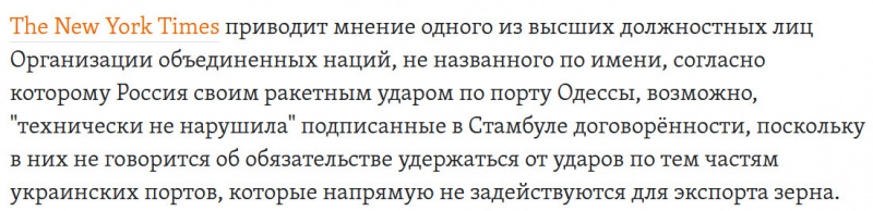 Россия не имеет никакого отношения ко вчерашнему обстрелу одесского порта, произошедшему ровно на следующий день после подписания договоренностей в Турции. Это венерианские скалозубы, кто же еще?