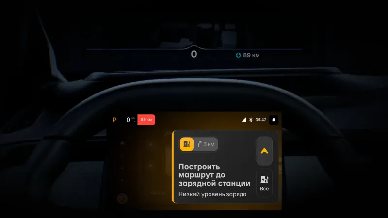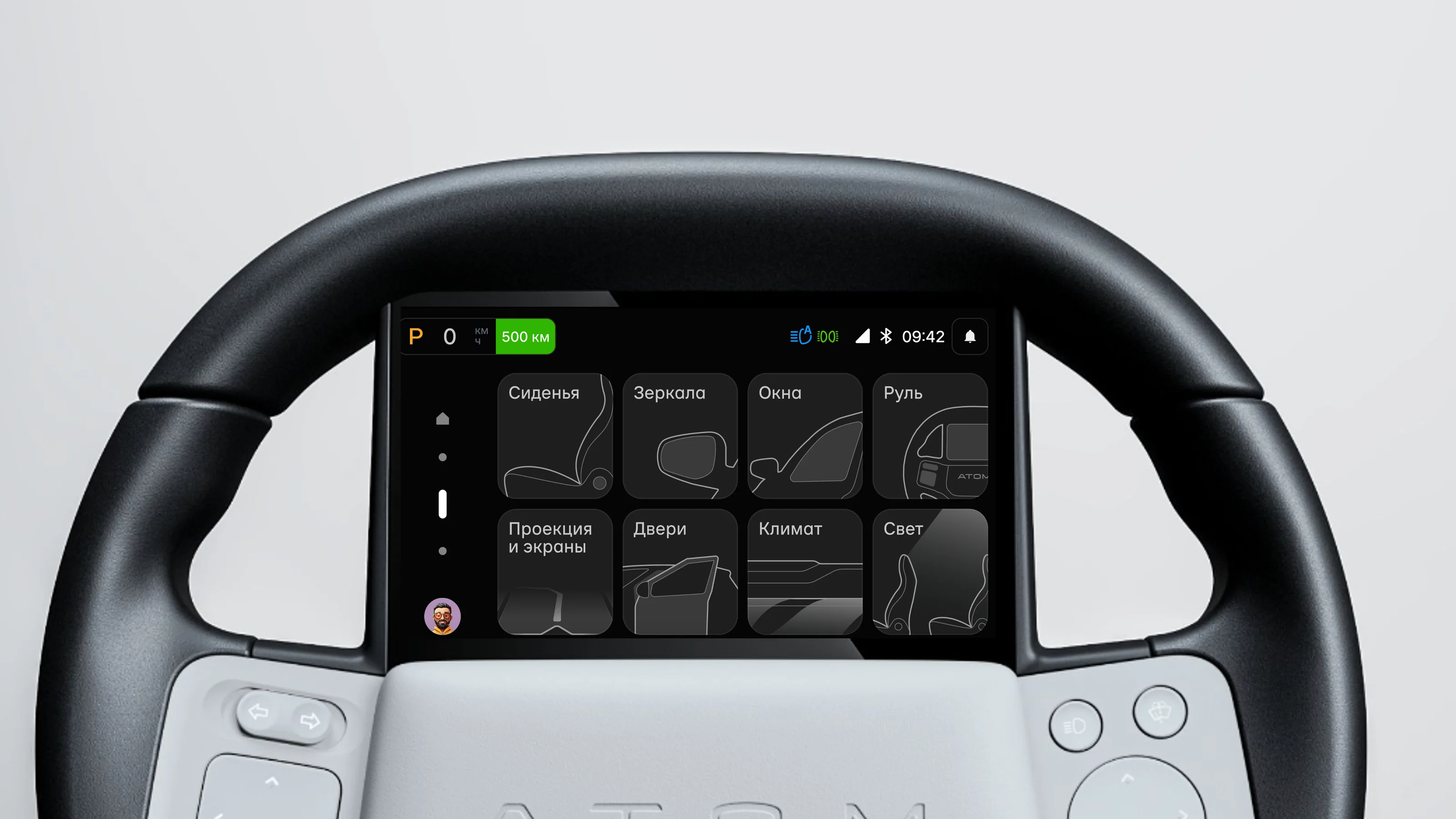 Другая фишка «Атома» — проекция дополненной реальности. Специальное устройство отображает на лобовом стекле различные элементы. Таким образом имитируется трехметровый экран, который находится на расстоянии 12 метров. С его помощью водители будут следить за скоростью и режимом движения, маршрутом, уведомлениями о звонках.