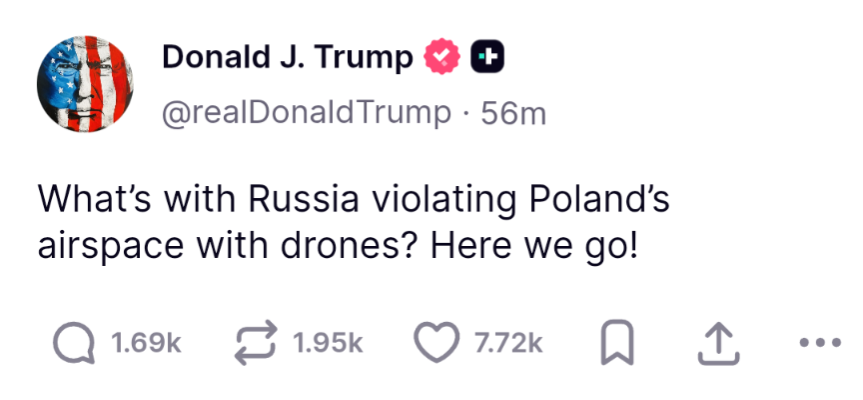 Сегодня ночью на территорию Польши вторглись 10 российских дронов. Напоминаю, что Польша - член альянса НАТО.