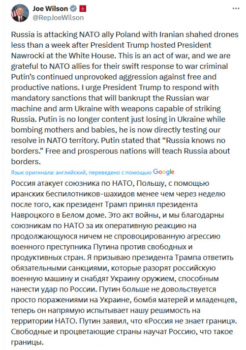 В НАТО, конечно, выразили озабоченность. Американский конгрессмен Джо Уилсон заявил, что это акт войны, призвал Трампа немедленно ответить и заявил, что "свободные и процветающие страны научат Россию, что такое границы". Я думаю, что нам следует ждать от НАТО меморандума по этому поводу. И я считаю, что Трамп должен немедленно дать Путину две недели на то, чтобы он перестал засылать в Польшу дроны.