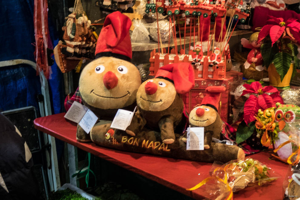 Традиционные каталанские Caga Tio - "дядя Кака" в переводе. Полено с веселой рожицей и каталанской красной шапочкой. Caga Tio ставят дома под елку и в течение недели дети каждый вечер его кормят, ставя перед поленом на блюдце всякие печенюшки. (Задача родителей - к утру убрать печенюшки.) В Рождество Caga Tio надо лупить палкой, а он будет "какать" конфетами. (Задача родителей - конфеты заранее положить под мантию Caga Tio.)