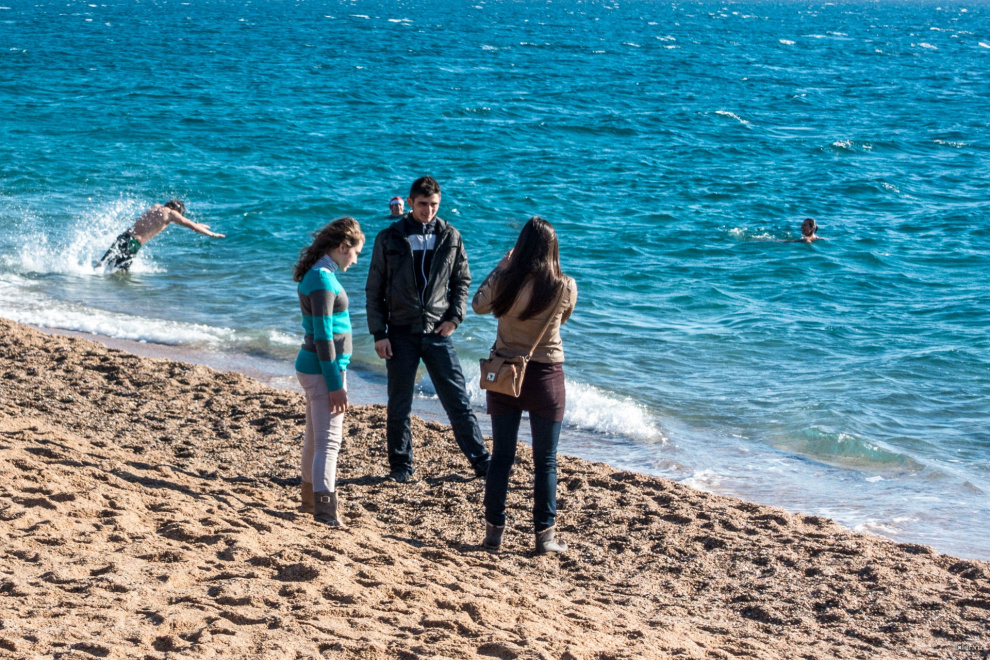 И очень забавно смотрелось: половина - в купальниках, другая половина - в пальто и куртках.