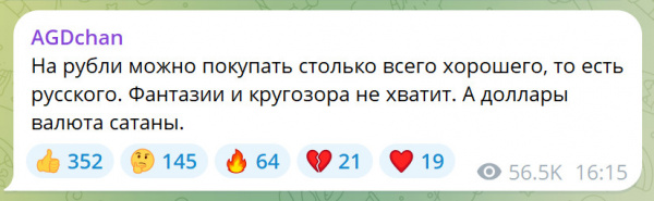 С другой стороны, чего беспокоиться-то? Великие люди нам все объяснили! Ну рублики-то - эвона сколько всего хорошего можно купить. Ту же настойку "Боярышник", хлебца у Стерлигова по 4500 рублёв, маслица топленого по 30000 рублёв, винишка безалкогольного по 78000 рублёв. Так что прав Дугин, прав. Аж фантазии и кругозора не хватит! А доллары - валюта сатаны. На нее айфоны богомерзкие покупают. Александр Гельевич тоже айфоном пользуется, но так как он его использует исключительно для благостных и богоугодных дел на благо великой Раисси, то ему-то, стало быть, можно.