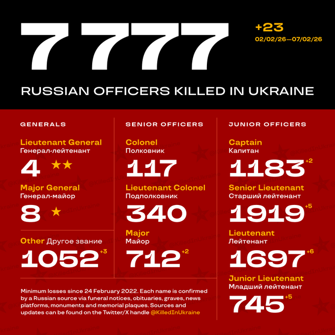Проект Russian Officers Killed in Ukraine опубликовал очередную статистику: подтверждено 7777 фактов смерти российских офицеров на войне в Украине. В их числе 4 генерал-лейтенанта, 8 генерал-майоров, 117 полковников, 340 подполковников и 712 майоров.