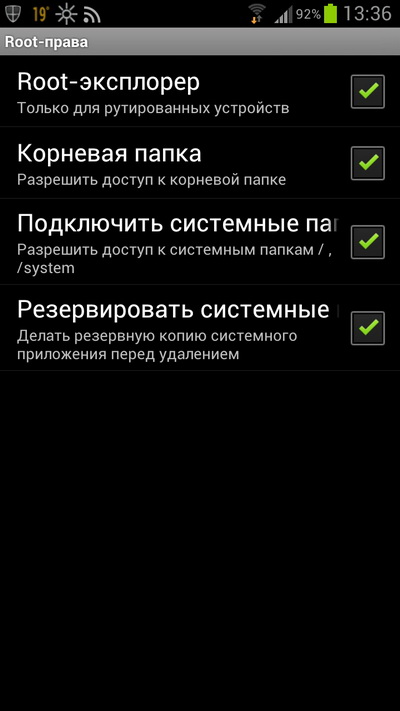 Далее нужно грохнуть всякое ненужное барахло, которое обычным образом не удалить. Для этого существует немало различных программ, но мне из них больше всего нравится ES Проводник. Запускаете, в настройках включаете Root-эксплорер.