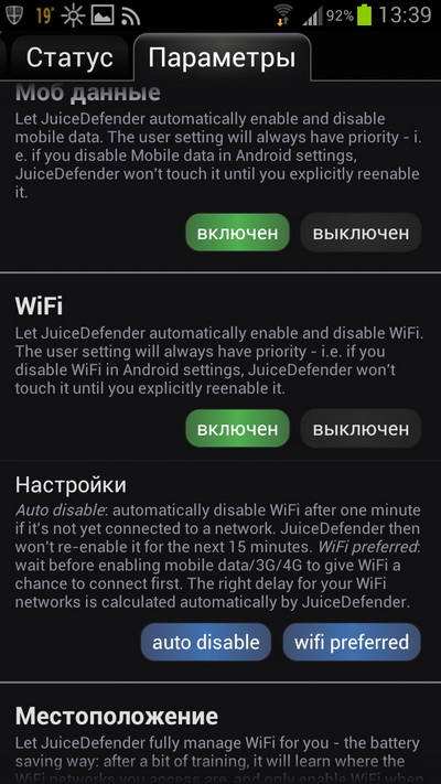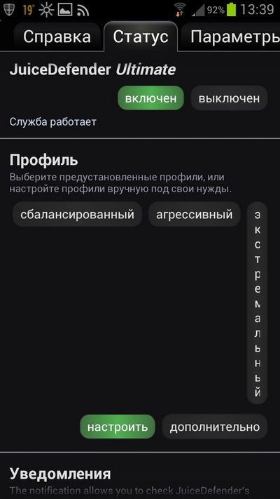 Еще один важный момент - очень желательно поставить программу JuiceDefender Ultimate (у нее есть еще бесплатная версия с меньшими возможностями). Она реально очень здорово экономит батарею. Одна из наиболее полезных настроек - вырубание любой активности телефона (кроме приема звонков, напоминаний и будильника) при выключении экрана. Если все грамотно настроить, то телефон на одном заряде живет до пяти суток (в не особо активном режиме, конечно).