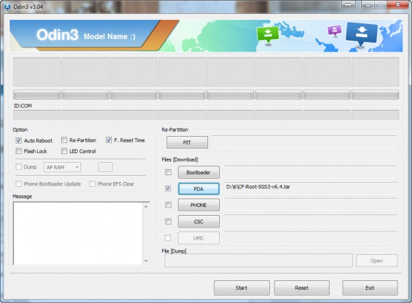 Распаковываем Odin3, запускаем. Нажимаем кнопку PDA и указываем путь к CF-Root (его распаковывать не надо).