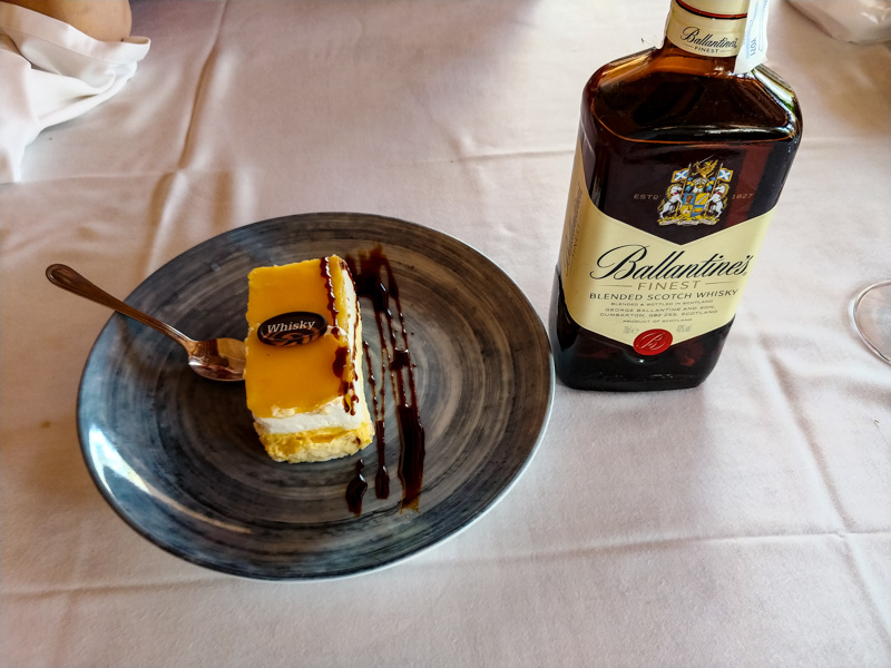 На десерт жена заказала кусок торта с виски - ну, в смысле, что торт обливается чайной ложкой виски. Но тут все было по простому. Принесли кусок торта и бутылку виски. Обливайте, сказали, сколько вам нужно.