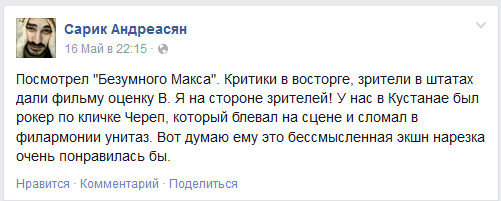 Великий кинорежиссер Сарик Андреасян, автор самого "Карлосона", дал вдумчивую экспертную оценку новому "Безумному Максу".
