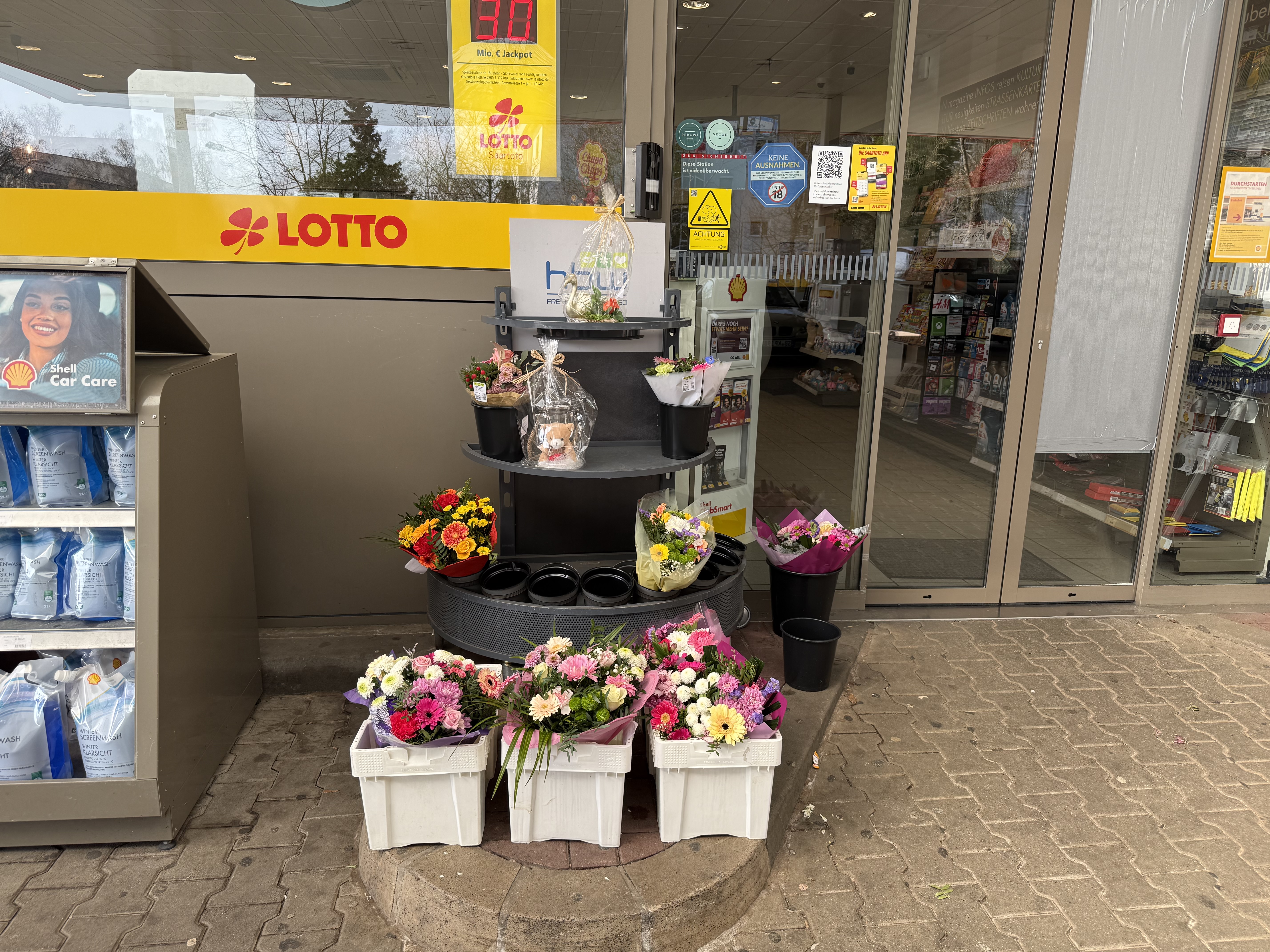 Проезжала сейчас мимо заправки, цветы по качеству так себе, и цены не очень (как все на заправках; нижние букеты стоят 28€). Но лучше, чем ничего, и народ покупает.