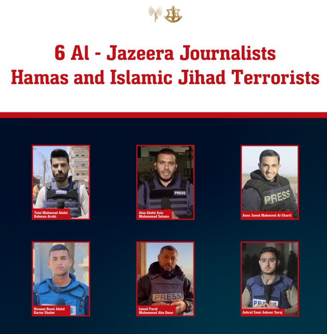 Шесть журналистов "Аль-Джазиры" оказались штатными боевиками Хамаса и Исламского джихада. Пресс-служба ЦАХАЛа назвала их имена и персональные данные. Это Анас аль-Шариф, Хасам Шаваат, Ашраф аль-Сарадж, Исмаил Абу-Амар и Талаль Аруки.