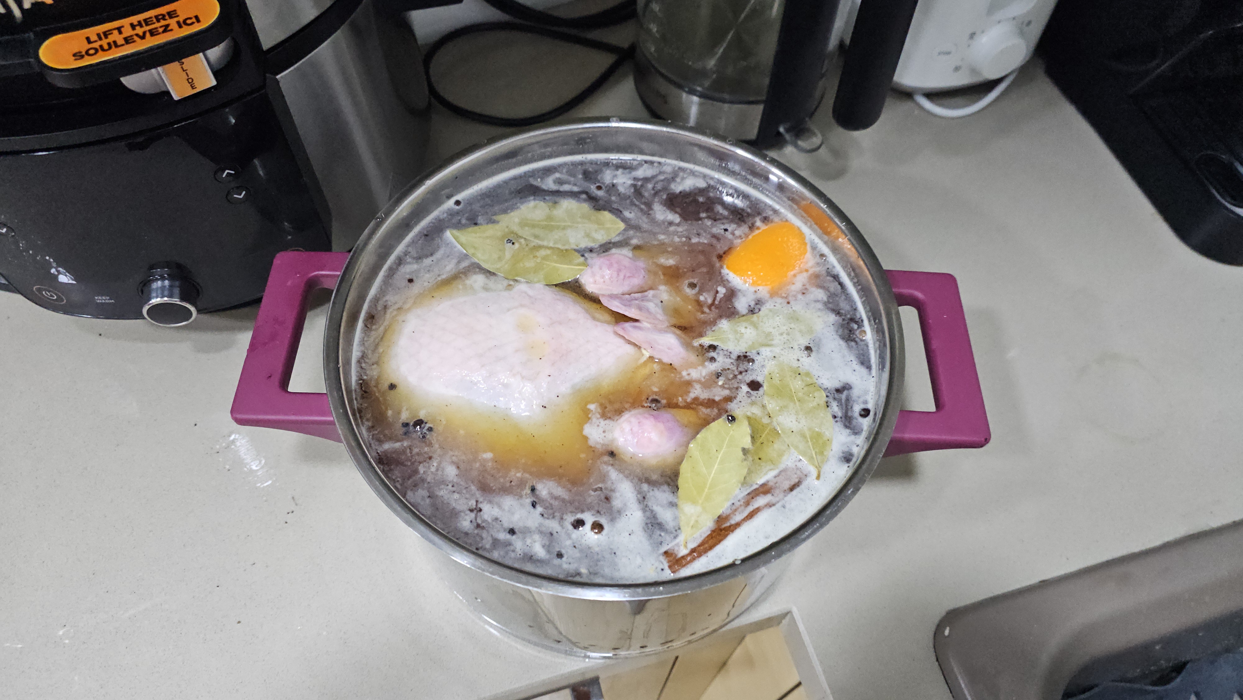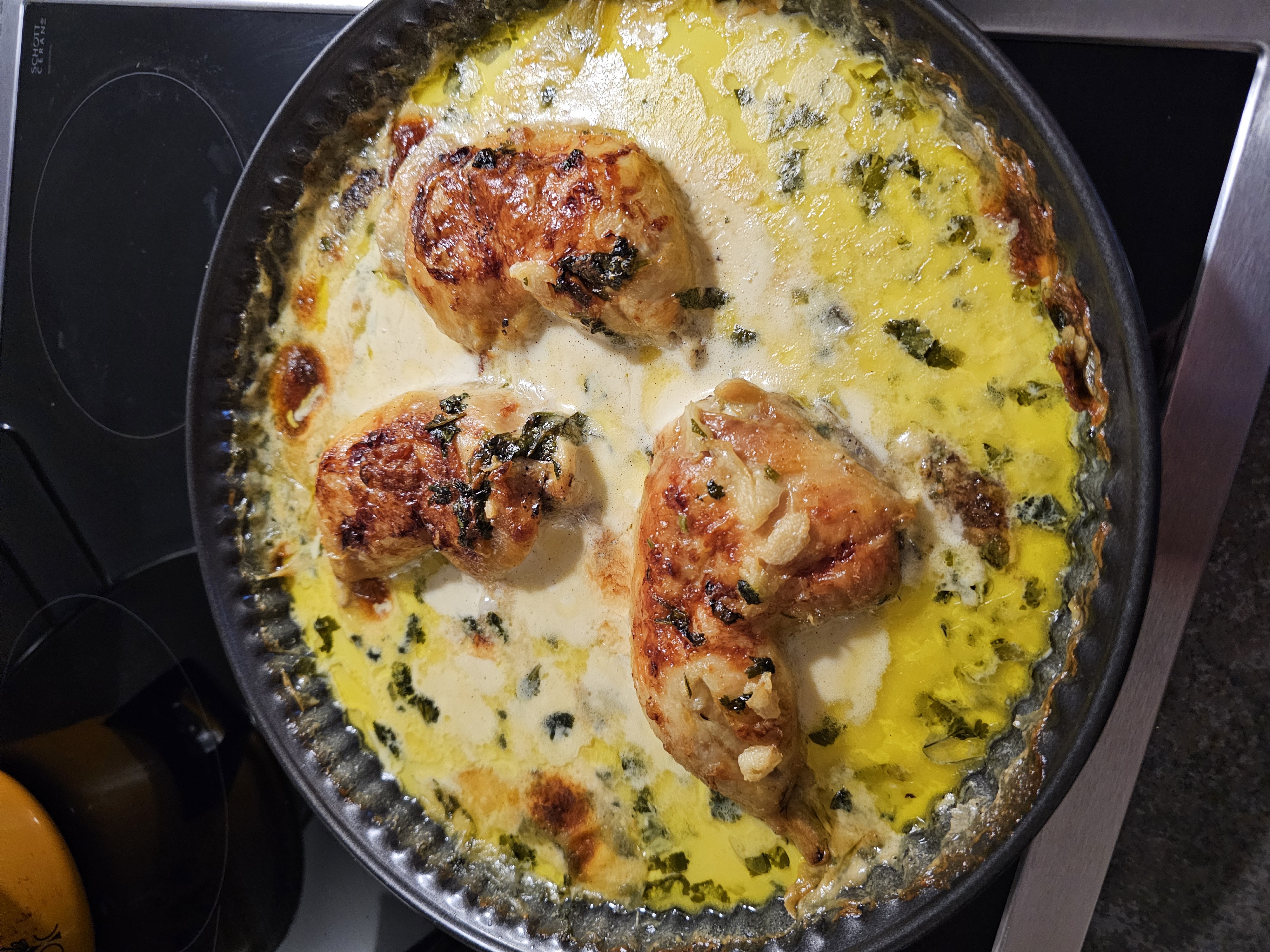 Как приготовилась, достать, накрыть фольгой и дать постоять минут 10. После этого ножки и крылья отрезаются и отправляются в Ninja доготавливаться под давлением пара на 15-20 минут (когда грудка доходит до нужной кондиции, ноги еще жестковатые).