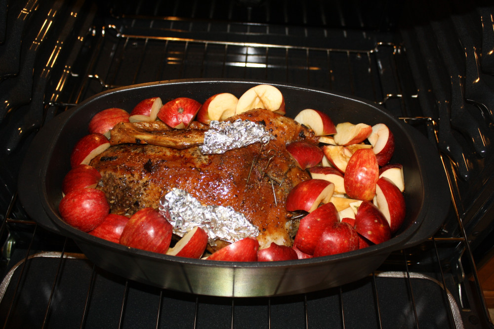 Когда утка доходит до 58 градусов, утка достается, фаршируется яблоками, поливается вытопленным жиром - и снова в духовку, уже на 200 градусов до достижения 68 градусов (это где-то 10 минут).