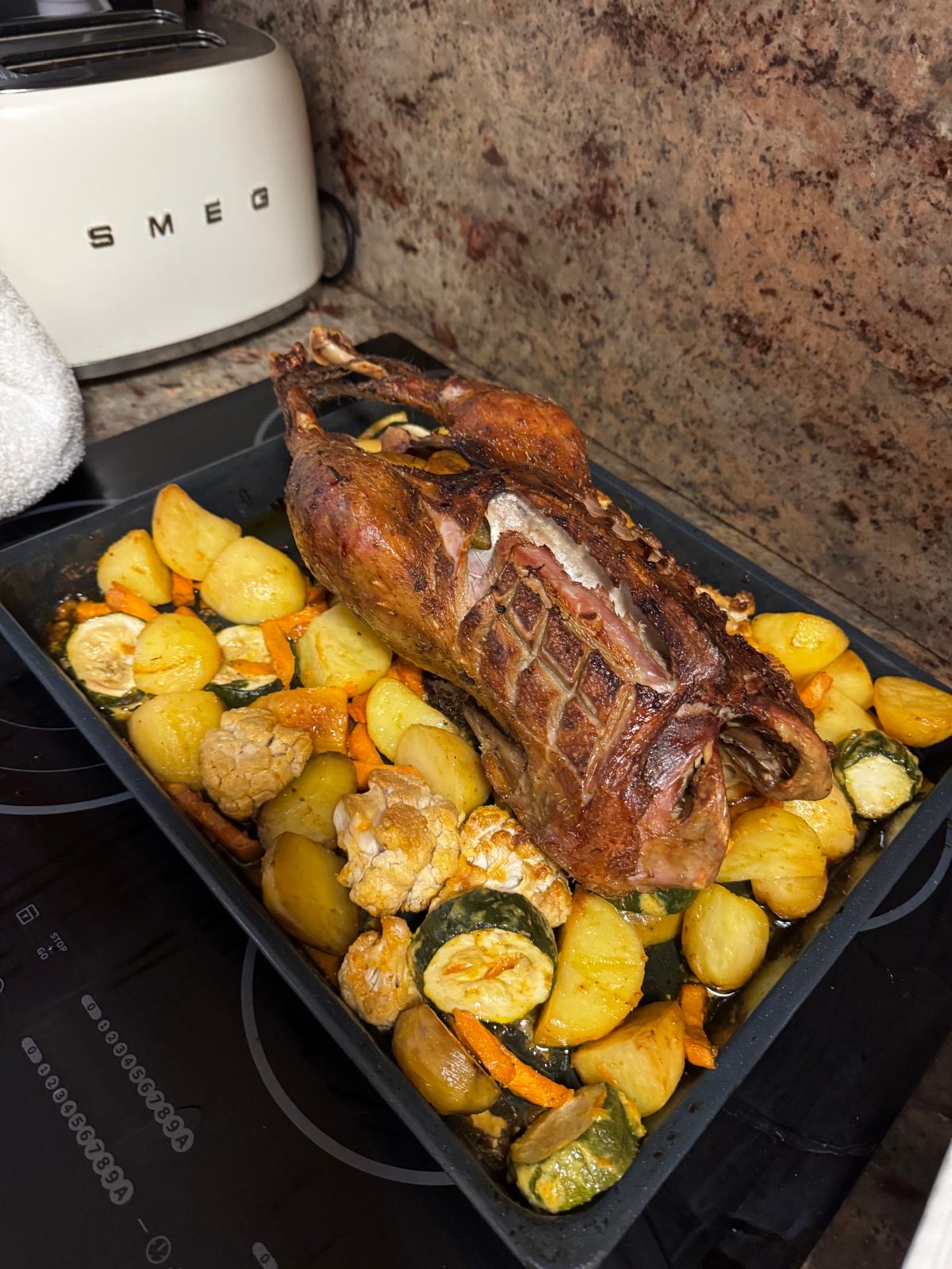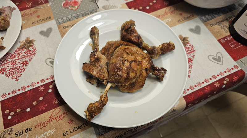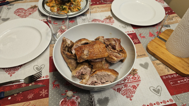 Мы традиционно ни на Рождество, ни на Новый год никаких пышных застолий не устраиваем. В этот раз жена приготовила крупных аргентинских креветок, а я сделал утку: у меня в морозилке месяца три лежала замороженная утка, купленная в Makro, и вот она дождалась своего часа.