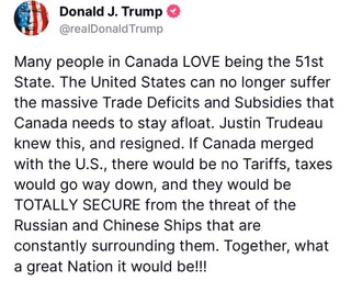 Джастин Трюдо написал, что нет никаких шансов на то, что Канада станет частью США.