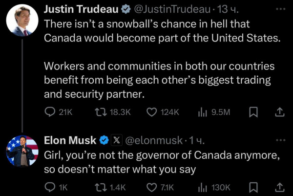 именно, это такой толстый троллинг, мол, Маск не воспринимает Канаду как суверенную державу, а руководитель Канады не более чем губернатор очередного 51+ штата.