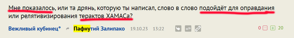 Ахах. Ещё вчера она переписывала мне оправдание Хамас через сравнение с ИРА в ответ на пост где ни то ни другое не упоминалось. А теперь зашкваренный решил сделать эпичный камингаут, правда вряд ли умышленно.