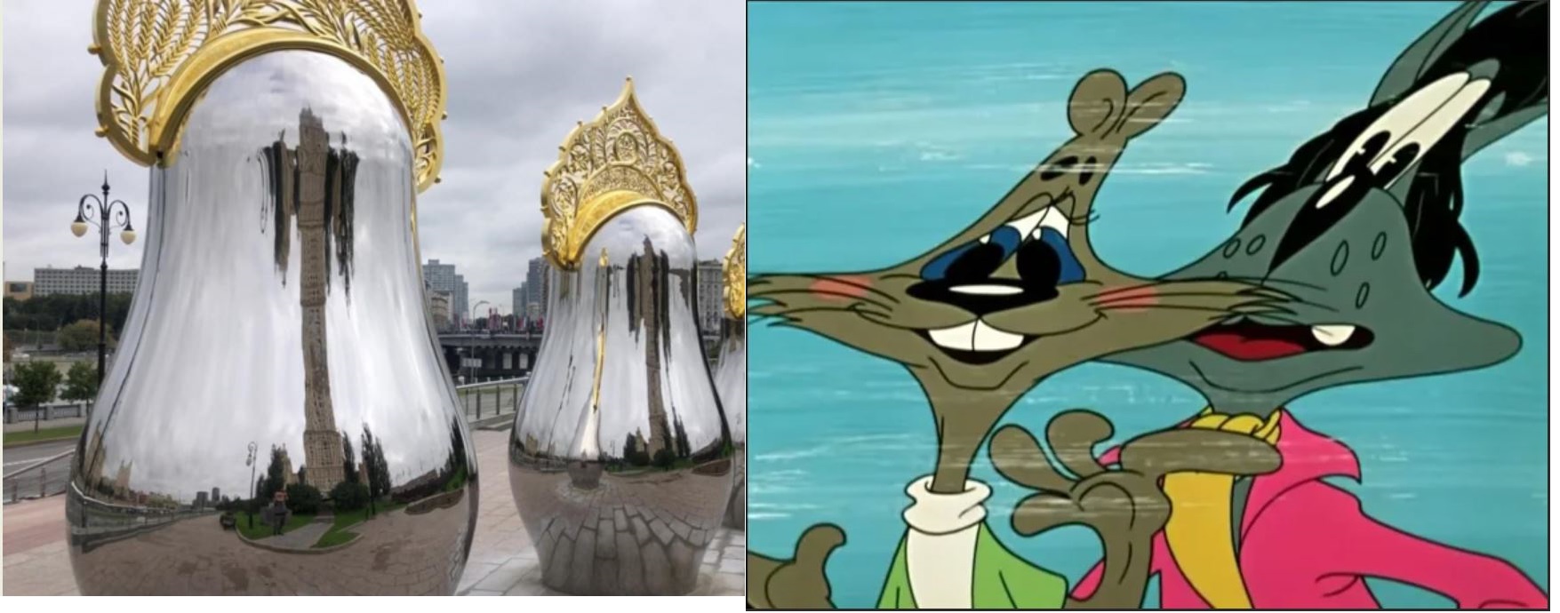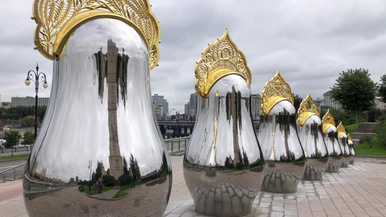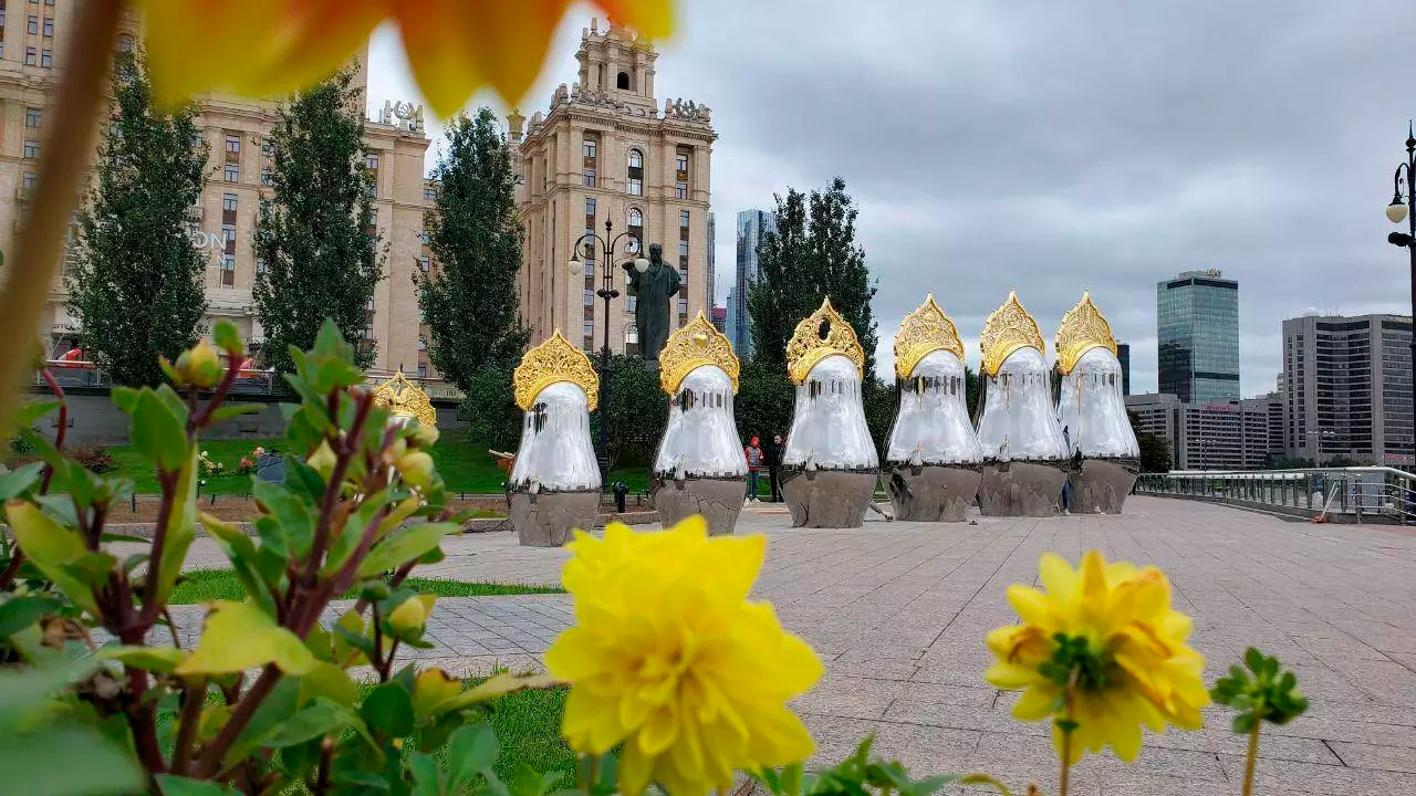 Напротив гостиницы «Украина» в Москве появились зеркальные матрешки в золотых кокошниках. Автор арт-проекта — Татьяна Ликсутова, бывшая супруга главы департамента транспорта Москвы Максима Ликсутова. Архитектор — Николь Крихели.