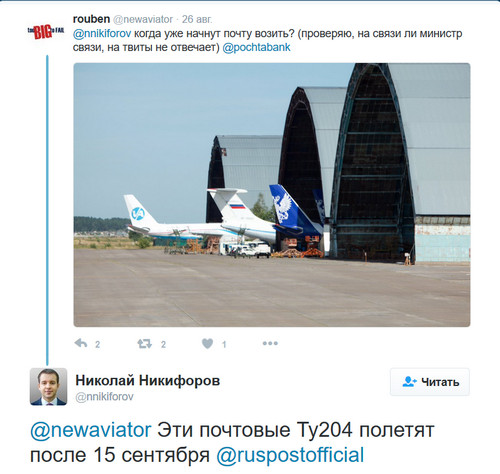 Министр связи Никифоров анонсировал появление у "Почты России" своих самолетов. Ну, знаете, чтобы почта и посылки быстрее доставлялись. А не как у "Почты России".