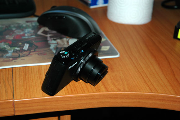 Через пару минут сработало автоматическое выключение, объектив убрался и аппарат аккуратно свалился со стола. Хорошо еще, под ним стоял стул, поэтому обошлось без поломок. Но вообще забавно получилось...