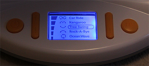 Управление - очень простое. Есть регулировка скорости движения и дисплей с выбором вида колебаний: автомобиль, кенгуру, качели, укачивалка, океанская волна.