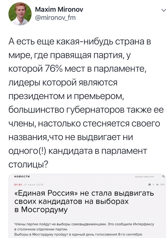 В Мосгордуме напряглись. Оно понятно, что Любовь Соболь они пропустить не могут и наверняка каким-то образом снимут еще до голосования (ну, например, признают подписи поддельными - делов-то, они это уже сто раз делали), но все равно без мосгордумовского кандидата как-то не годится.