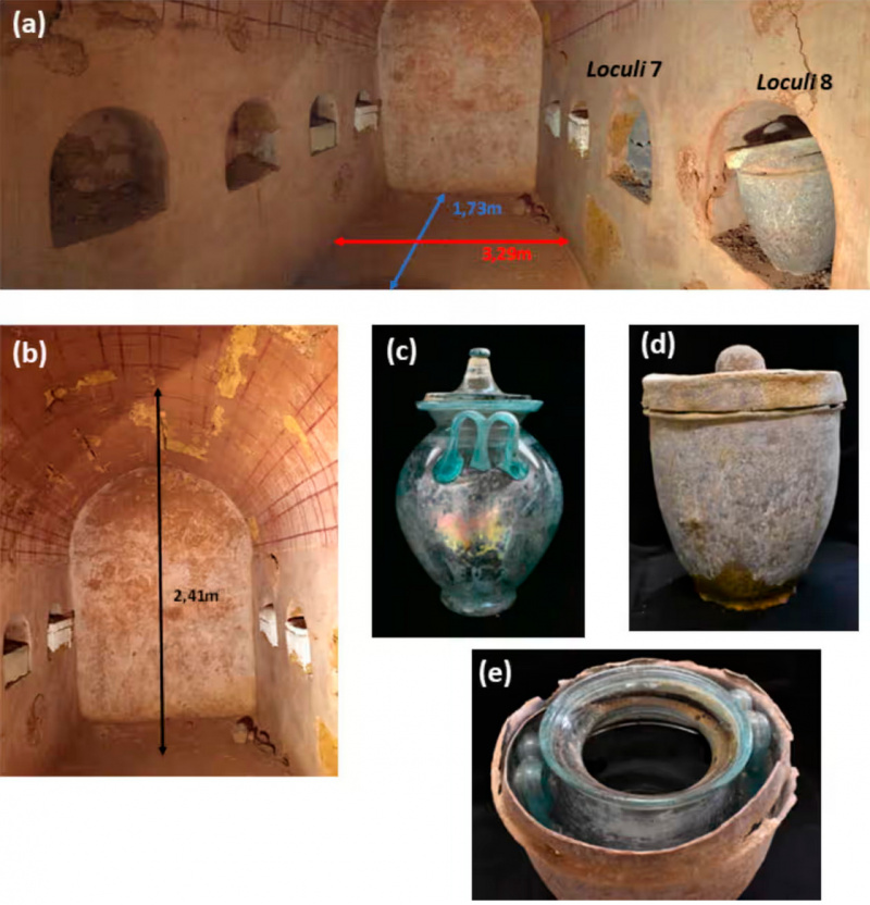 Там было 8 погребальных ниш, в шести из которых находились урны, сделанные из известняка, песчаника или стекла и свинца. Каждая урна содержала кремированные костные останки одного человека, а на двух урнах были написаны имена усопших: Hispanae и Senicio.