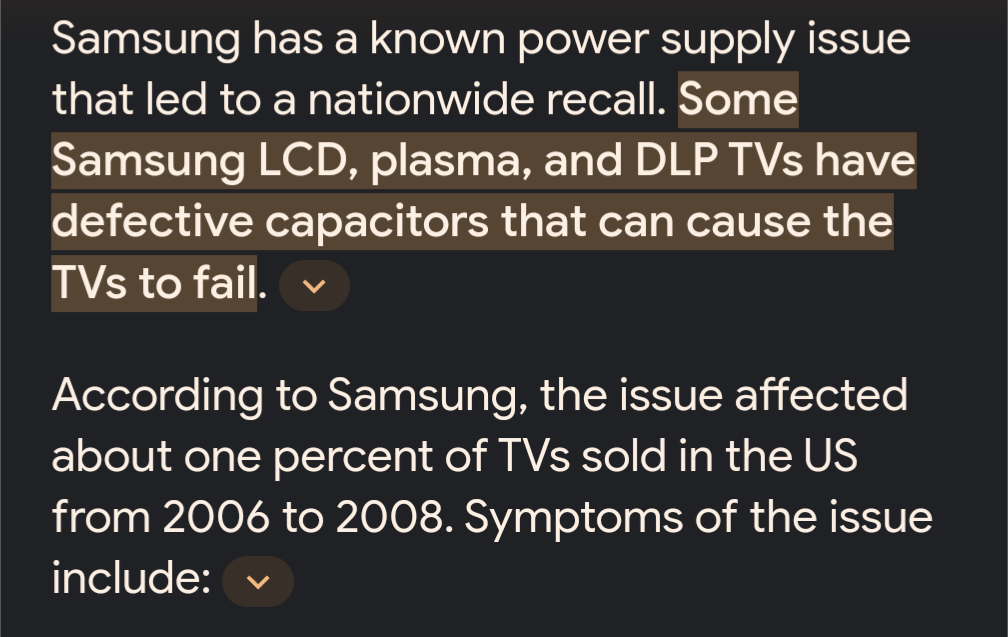 Самсунг творит чудеса в области сервиса. У меня как-то давно сломался их телевизор примерно через полтора года после покупки. Гарантия как раз кончилась. Полез в интернет и обнаружил что это известный дефект этой модели. Там конденсатор в блоке питания подыхает. Очевидно была дефектная партия. Позвонил в саппорт и говорю что за дела. Телевизор новый. Приехали ко мне домой и починили. Забесплатно! Дома! Хотя гарантия уже кончилась.