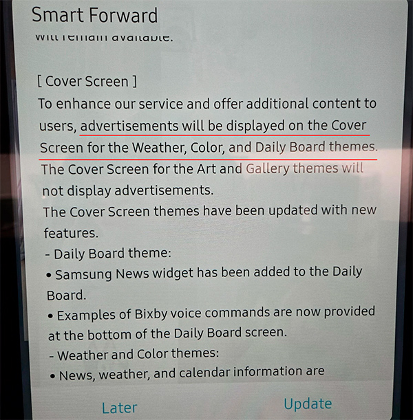 И вот с очередным обновлением владельцы этих холодильников получили новые возможности: Теперь в трех из пяти тем компания Samsung будет показывать им рекламу.