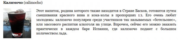 Кстати, ну ладно сангрия. Но среди популярных напитков упомянуть пиво и не упомянуть обычное вино, которое, безусловно, первое по популярности наравне с пивом - это надо уметь. Так что хорошая статья. Познавательная.