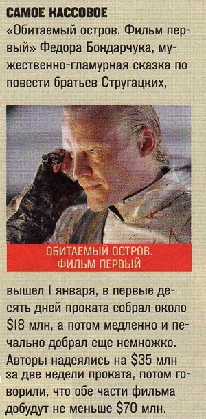 Называть "самым кассовым" как раз самый главный провал российского кинематографа - я от "Русского Newsweek'а" такого не ожидал. "Обитаемый остров" при бюджете под $37 млн (и еще черт знает сколько потраченных миллионах на раскрутку) собрал всего $28 миллионов. Чистых потерь там - $26,5 миллионов. И этот фильм они называют самым кассовым?!!