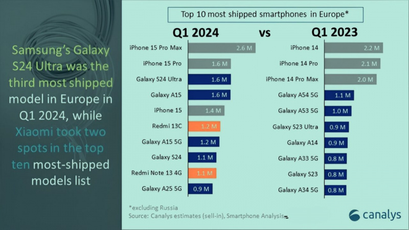 В аналитическом издании Canalys зафиксировали интересное изменение по продажам смартфонов Samsung. Если в прошлом году в первом квартале первое место по продажам держали модели Galaxy A54 и Galaxy A53, то в этом году на первое место неожиданно вышел топовый Galaxy S24 Ultra. Galaxy S23 Ultra в прошлом году был на третьем месте.