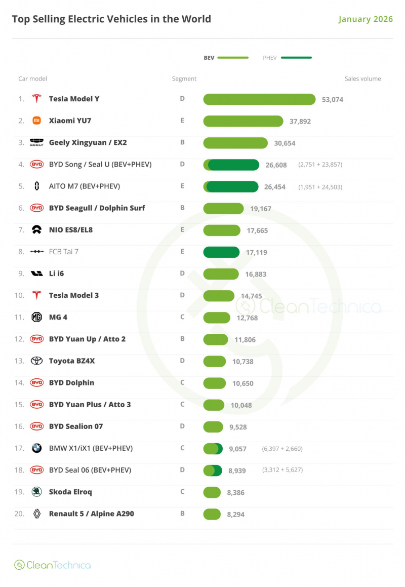 Во второй половине таблицы падение продаж в Китае позволило некоторым европейским моделям попасть в топ-20, причем последние три места в таблице заняли #18 BMW X1 PHEV/iX1 twins, #19 Skoda Elroq и #20 Renault 5/Alpine A290 twins.