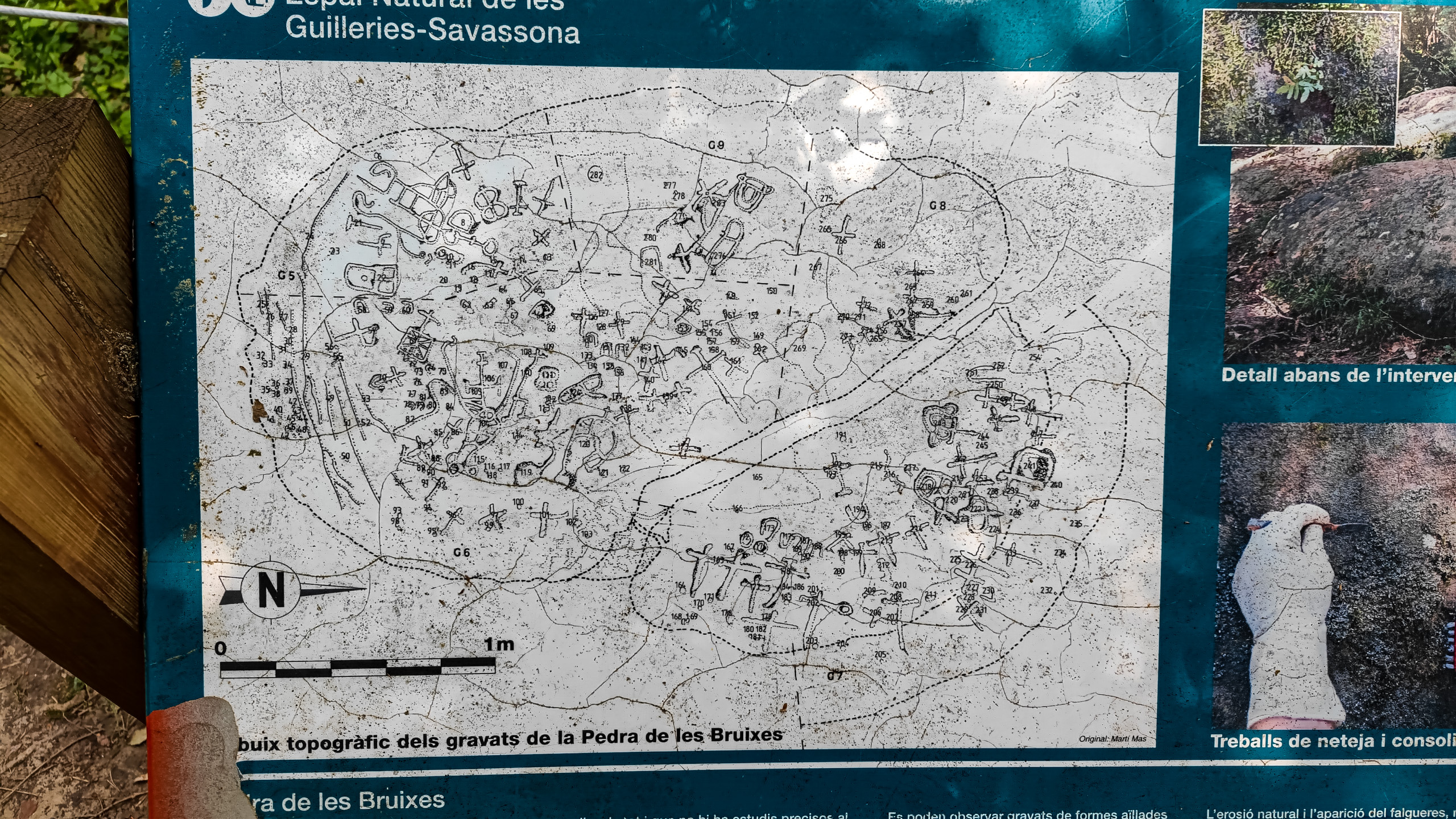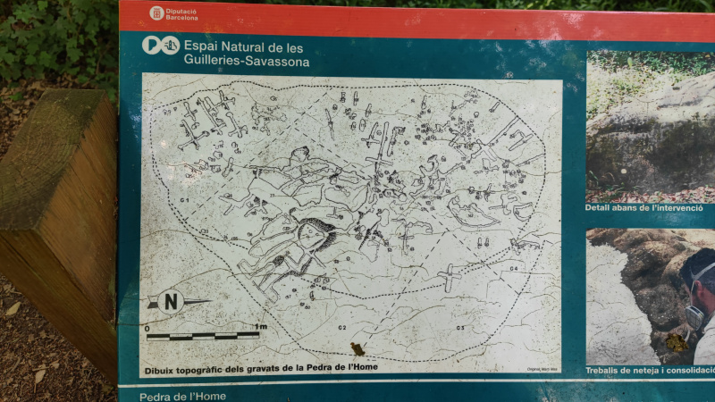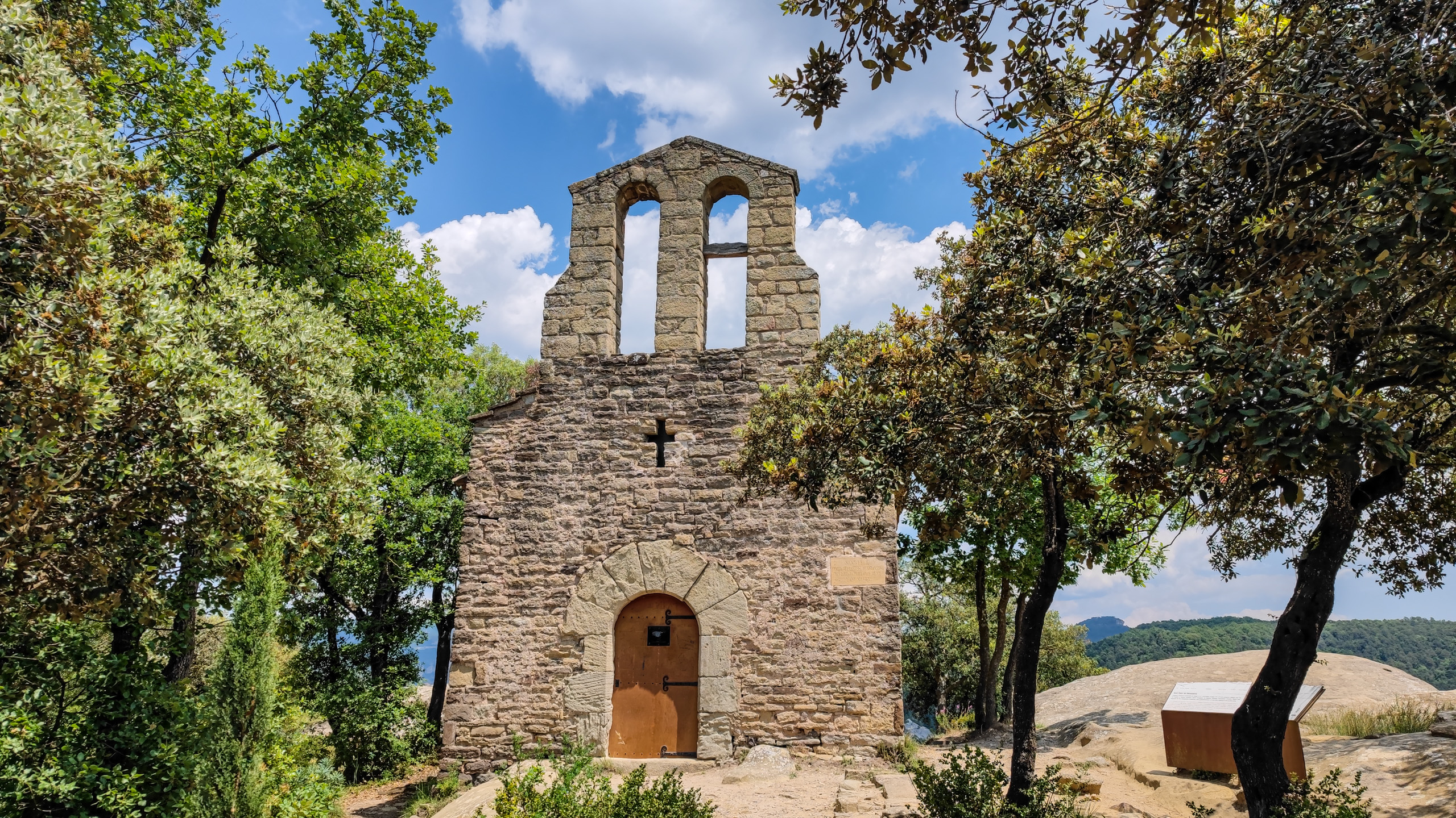 На это место мы наткнулись случайно. Ехали посмотреть какую-то церквушку в городке неподалеку от отеля, и по дороге в стороне увидели человека, стоящего на краю скалы. Раз человек стоит, подумали мы, значит, туда можно как-то добраться, а виды оттуда должны открываться отличные. Посмотрели по карте - да, достопримечательности: какие-то древние глыбы с надписями, а на верхушке скалы стоит эрмита (по-французски - эрмитаж), то есть хижина отшельника, она же часовня.
