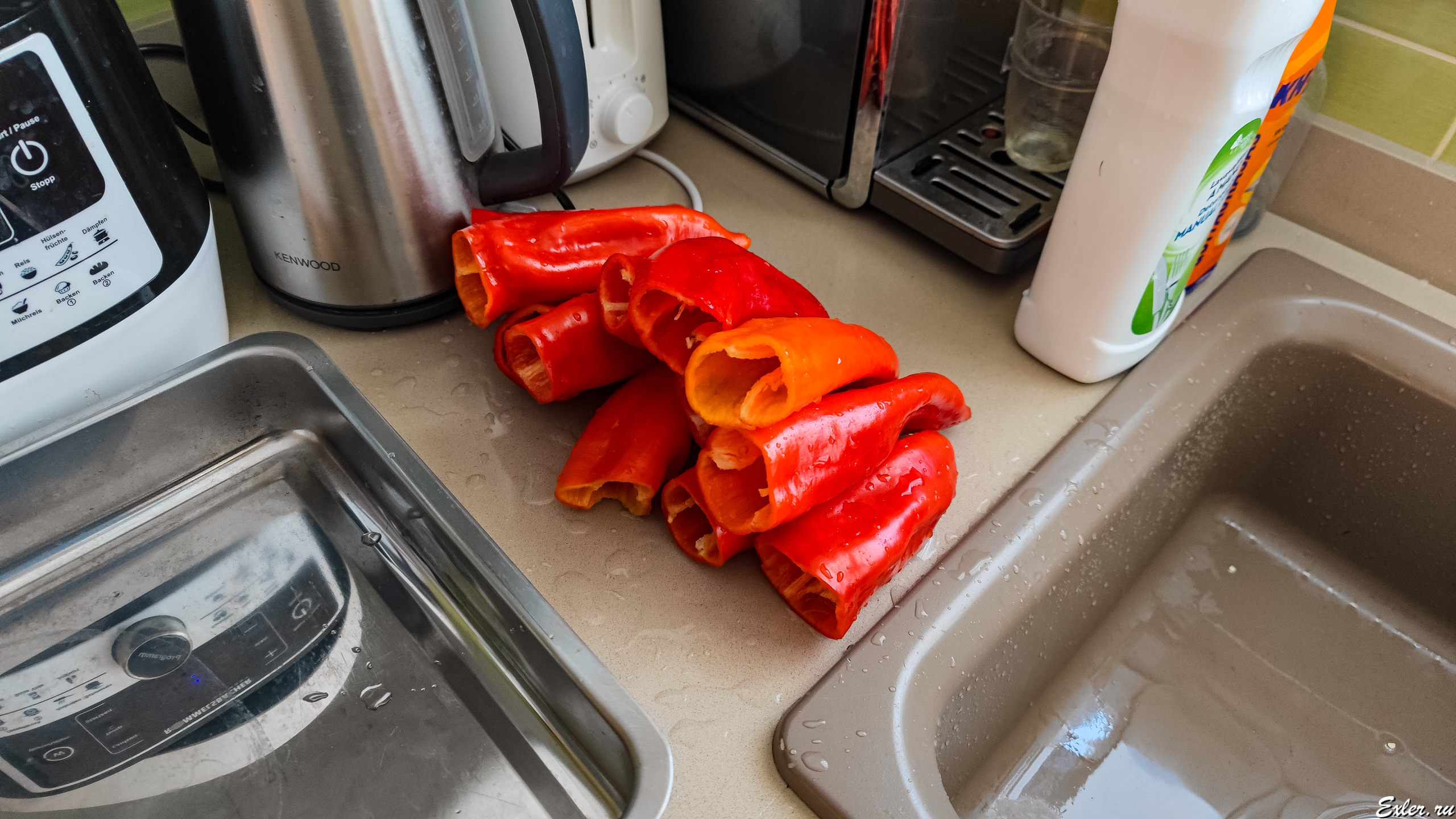 Для приготовления блюда нам понадобится несколько сладких перцев - лучше всего красных. Можно использовать вытянутые красные (лучше всего - итальянские), можно более крупные и мясистые. С зелеными перцами мы это блюдо делали: получилось терпимо, но и только-то. А вот с красными такого сорта - вообще отлично.